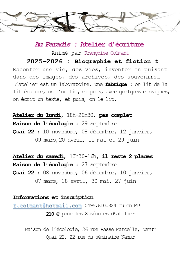 Raconter une vie, des vies, inventer en puisant dans des images, des archives, des souvenirs… L’atelier « Au Paradis » est un véritable laboratoire d’écriture : on lit de la littérature, on l’oublie, puis, avec quelques consignes, on écrit et on lit nos textes. Une expérience entre biographie et fiction pour explorer toutes les formes d’écriture !