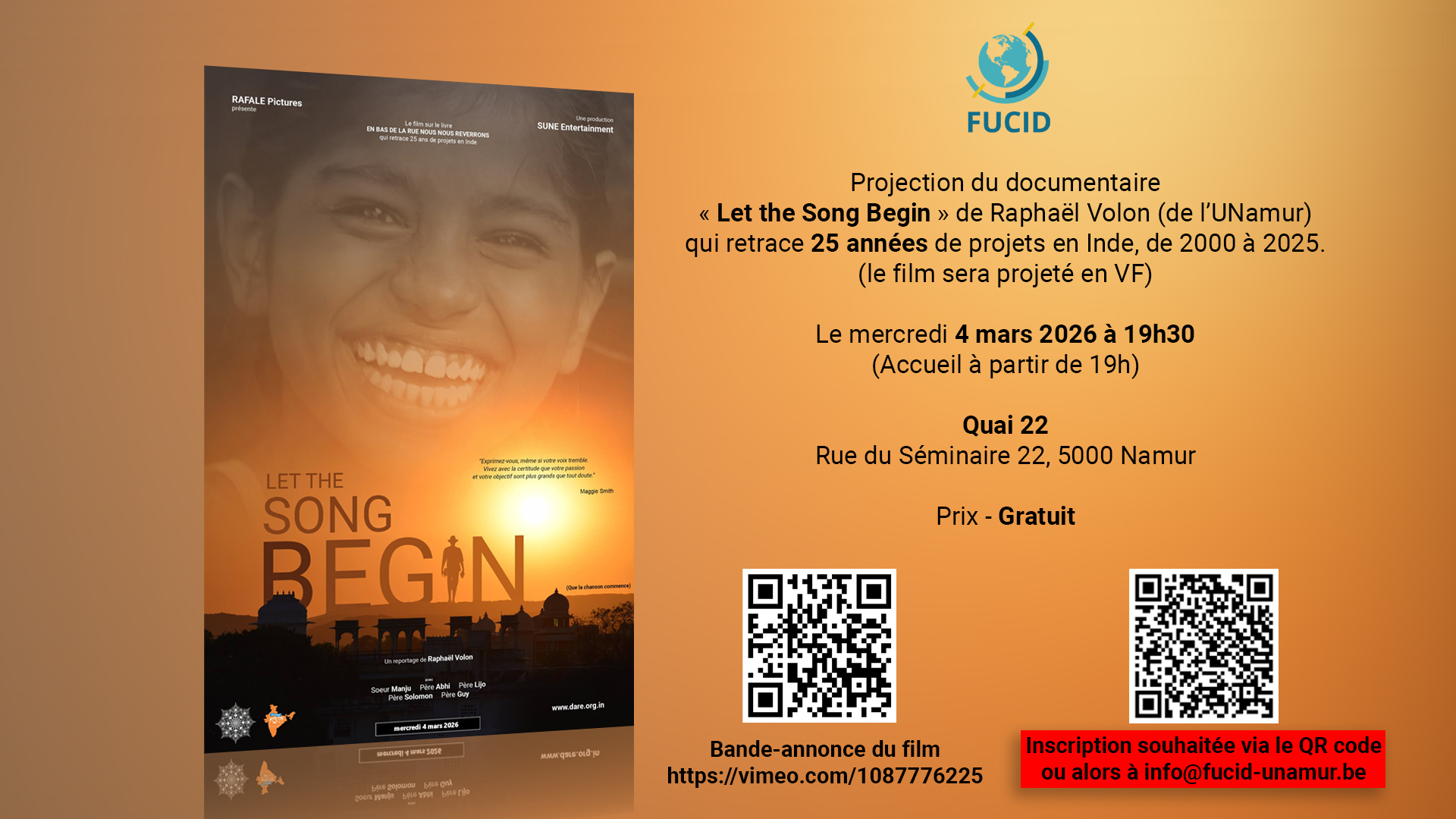 Projection du documentaire « Let the song begin » de Raphaël Volon (de l'UNamur), qui retrace 25 années de projets en Inde, de 2000 à 2025.